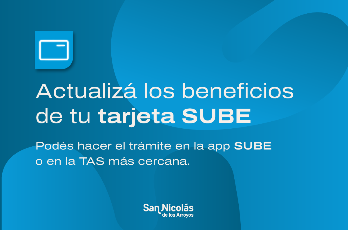 Tener la Tarjeta SUBE actualizada garantiza la vigencia de los beneficios. Es por eso que la Municipalidad de San Nicolás informa que en los próximos días todas aquellas personas que cuentan con estos beneficios (estudiantes, docentes y auxiliares) deberán actualizar su tarjeta. El trámite se puede realizar desde la app SUBE o en una Terminal Automática.