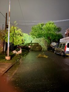 Durante toda la noche, los equipos municipales trabajaron en la atención de los reclamos, priorizando la remoción de árboles y postes caídos, además de otras situaciones de riesgo.